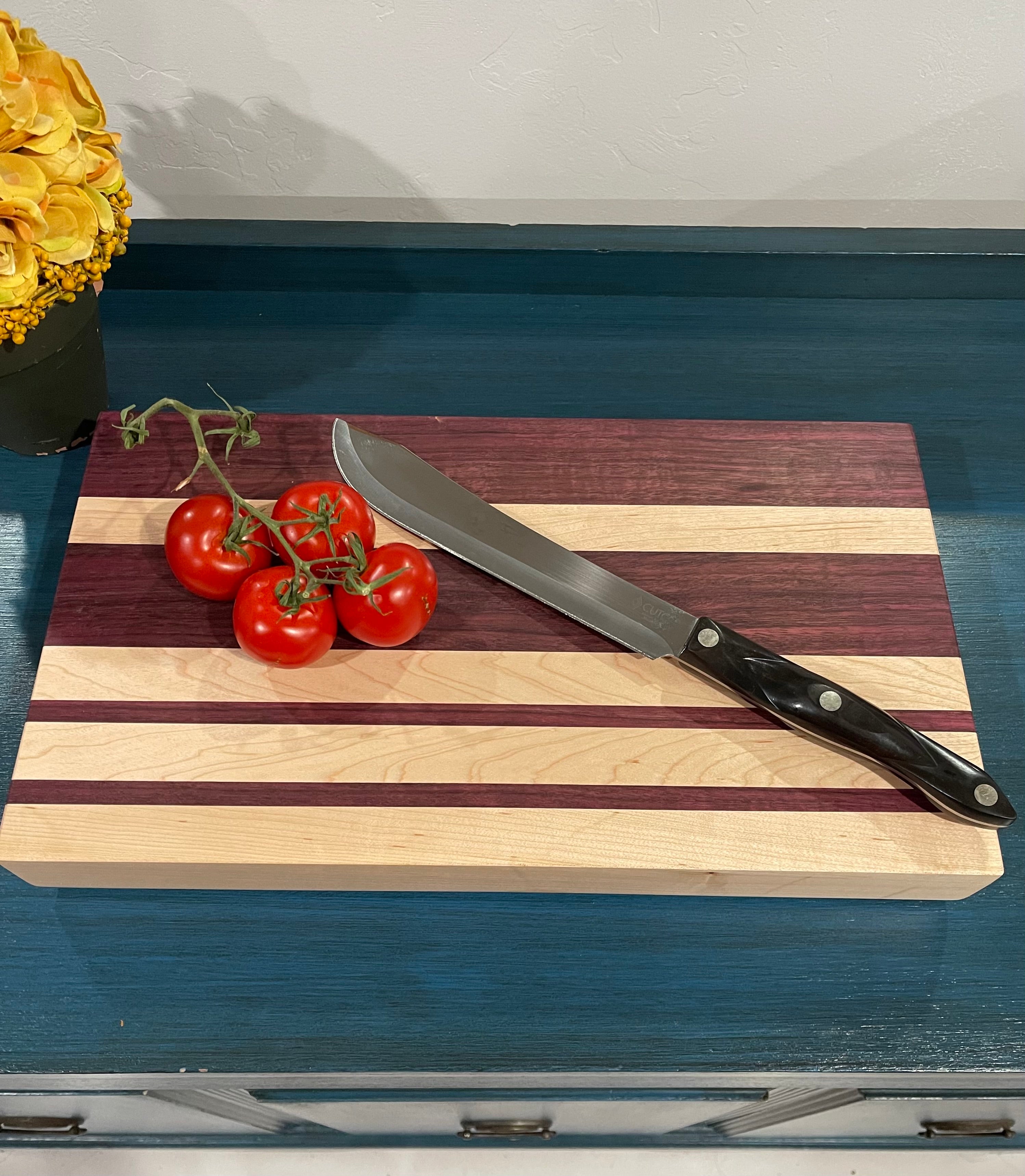 We bought the purple Stripes cutting board. Oh my gosh! What a beautiful piece of wood and the workmanship is remarkable. Now, we’re giving thought to how many people we can gift with these wonderful pieces that are also very reasonably priced. We agree with another reviewer: we want to hang it on the wall to admire it between uses. Great work Barney and Aurora!!