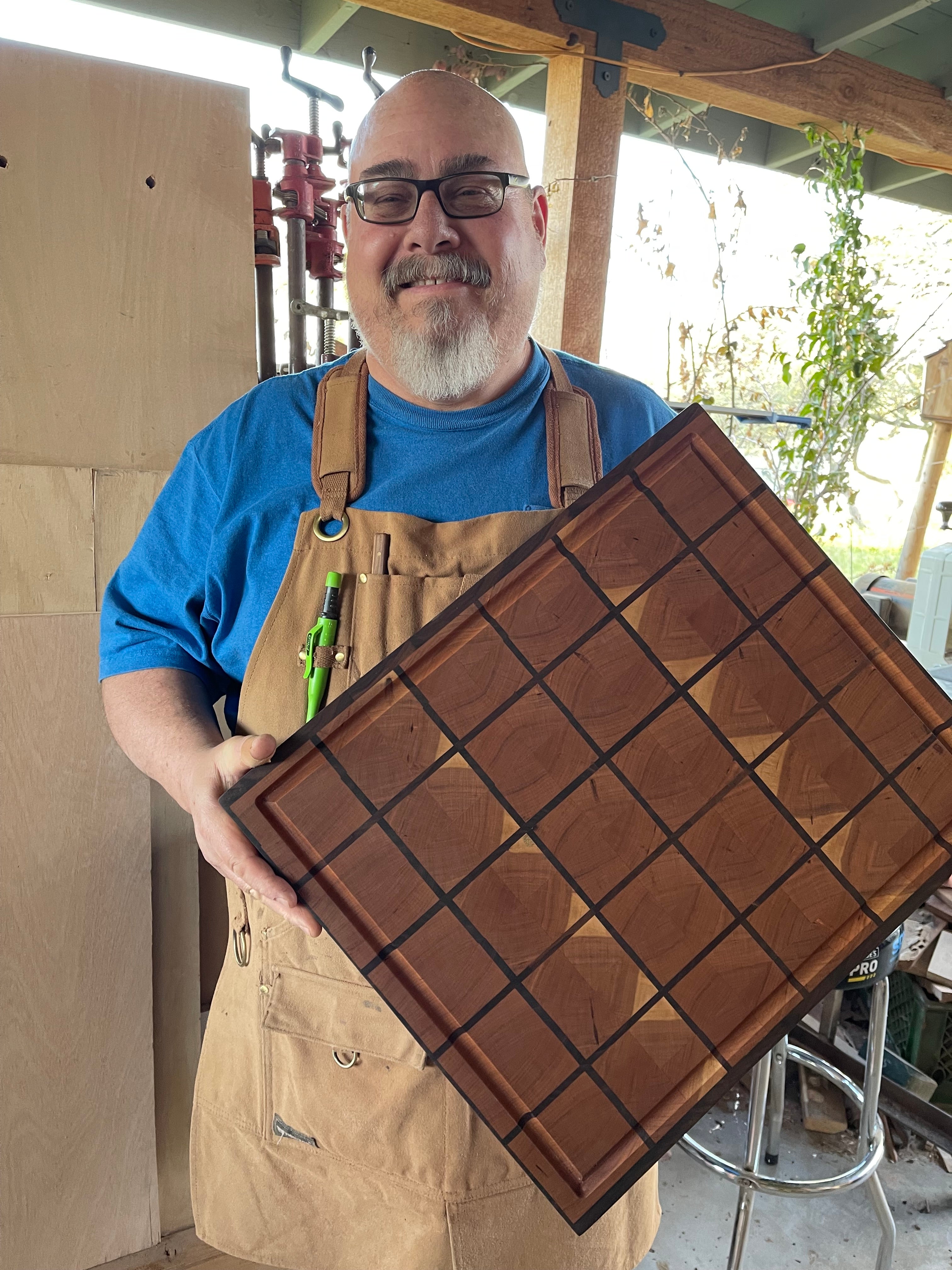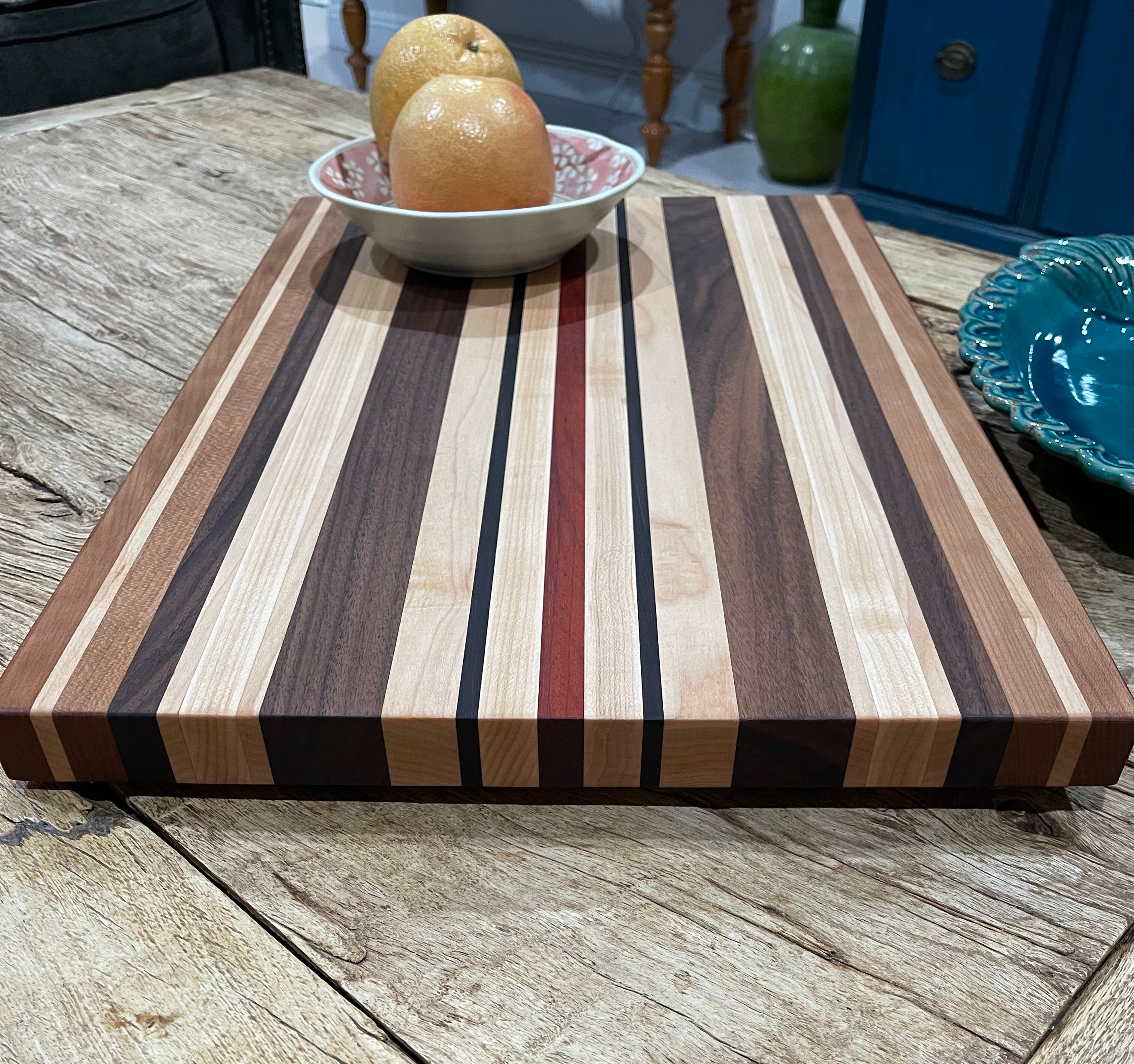 We bought the purple Stripes cutting board. Oh my gosh! What a beautiful piece of wood and the workmanship is remarkable. Now, we’re giving thought to how many people we can gift with these wonderful pieces that are also very reasonably priced. We agree with another reviewer: we want to hang it on the wall to admire it between uses. Great work Barney and Aurora!!